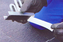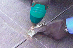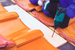 補強板に、架台設置用の金具(ステンレス)を取り付けます。ここでも防水処理として、瓦と金具が重なる部分にシーリング材を施します。