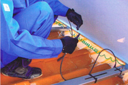 野地板に補強板をとめます。なお、補強板の裏や補強板を止めるビスには防水シールやシーリング材などの防水対策を施します。